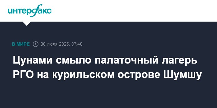 "Большой лагерь на Шумшу, где разместились участники поисковой экспедиции, не пострадал. Он находится в цунамибезопасной зоне. Смыло небольшой палаточный лагерь Российского географического общества, который расположился на восточном побережье острова. Людей своевременно предупредили, и никто не пострадал", - говорится в сообщении.