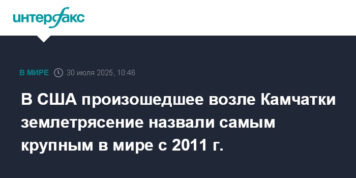 Москва. 30 июля. INTERFAX.RU - Землетрясение магнитудой 8,8, эпицентр которого располагался возле полуострова Камчатка, стало самым мощным подобным стихийным бедствием с 2011 года и одним из 10 сильнейших землетрясений во всем мире с 1900 года, сообщила в среду Геологическая служба США.