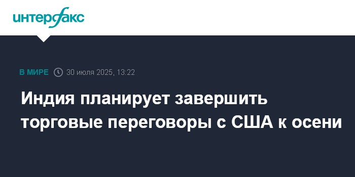 Москва. 30 июля. INTERFAX.RU - Индийские власти рассчитывают до осени довести до конца переговоры с США о заключении торгового соглашения, передает в среду Bloomberg со ссылкой на источники.