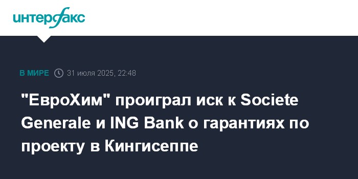 Москва. 31 июля. INTERFAX.RU - Высокий суд Лондона отказал "ЕвроХиму" в иске против Societe Generale и ING Bank о выплатах по гарантиям, выданным для проекта завода удобрений в Кингисеппе - "ЕвроХим Северо-Запад-2" (ЕХСЗ-2).