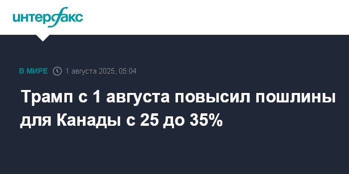 "Сегодня президент Дональд Трамп подписал указ, повышающий таможенный тариф для Канады с 25% до 35%, причем более высокий тариф должен вступить в силу 1 августа 2025 года", - сообщила администрация президента.