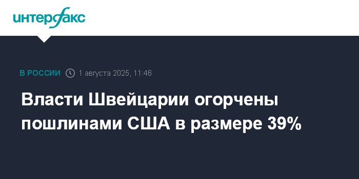 Москва. 1 августа. INTERFAX.RU - Правительство Швейцарии разочаровано мерами администрации США, которая с 1 августа ввела в отношении Берна пошлины в размере 39%.