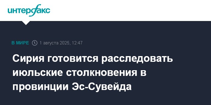 Москва. 1 августа. INTERFAX.RU - Сирийская администрация сформировала комитет, в обязанности которого входит расследование обстоятельств столкновений в провинции Эс-Сувейда на юге страны, жертвами которых в июле стали сотни человек, сообщают в пятницу западные СМИ.