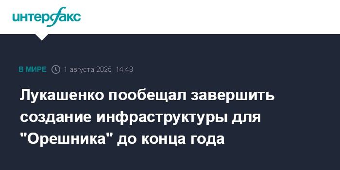 Москва. 1 августа. INTERFAX.RU - Президент Белоруссии Александр Лукашенко заявил, что строительство и создание инфраструктуры для ракетного комплекса "Орешник" планируется завершить в 2025 году.