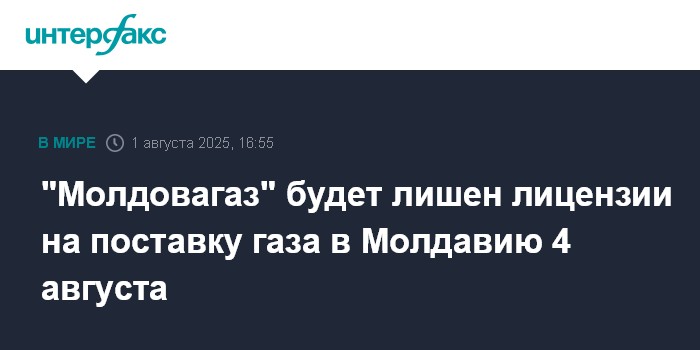 "По истечении крайнего срока 31.07.2025, предоставленного АО "Молдовагаз" для выполнения требований по функциональному, директивному и юридическому разделению от других видов деятельности в секторе, Национальное агентство по регулированию в энергетике отмечает, что оператор не уведомил агентство о выполнении вышеуказанных условий, - говорится в заявлении. - Начиная с 01.08.2025, ANRE вправе отозвать лицензию (...) от 06.11.2018, выданную АО "Молдовагаз", на деятельность по поставке природного газа".