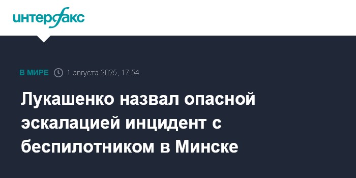 Москва. 1 августа. INTERFAX.RU - Президент Белоруссии Александр Лукашенко назвал опасной эскалацией недавний инцидент с боевым БПЛА в Минске и призвал прекратить это. Он сказал об этом на встрече с президентом России Владимиром Путиным на Валааме, трансляцию которой вел телеканал "Россия 24".