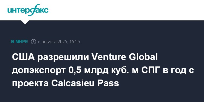 Москва. 5 августа. INTERFAX.RU - Минэнерго США выдало компании Venture Global окончательное разрешение на дополнительный экспорт сжиженного природного газа в страны, с которыми у Штатов нет соглашения о свободной торговле, с проекта Calcasieu Pass (штат Луизиана), сообщило Минэнерго.