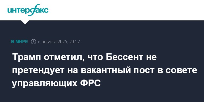 Москва. 5 августа. INTERFAX.RU - Президент США Дональд Трамп не рассматривает кандидатуру министра финансов Скотта Бессента на вакантное место в совете управляющих Федеральной резервной системы (ФРС).
