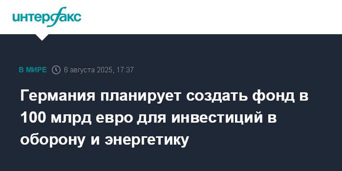 Москва. 6 августа. INTERFAX.RU - Власти Германии готовятся дать старт работе инвестиционного фонда размером в 100 млрд евро для вложений в оборону и сферу энергетики, для обеспечения страны ключевыми ресурсами. Об этом сообщает в среду Bloomberg со ссылкой на министерство экономики ФРГ.
