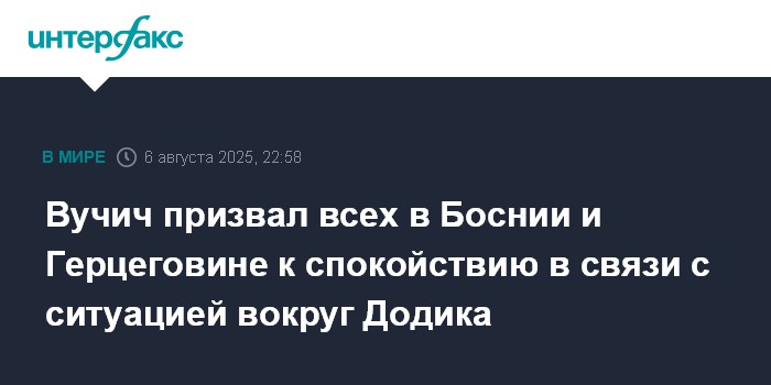 Москва. 6 августа. INTERFAX.RU - Президент Сербии Александр Вучич, комментируя ситуацию, которая складывается вокруг президента Республики Сербской (в составе Боснии и Герцеговины) Милорада Додика, призвал всех к спокойствию.