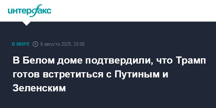 Москва. 6 августа. INTERFAX.RU - Президент США Дональд Трамп готов провести встречу и с главой РФ Владимиром Путиным, и с украинским лидером Владимиром Зеленским, заявила в среду пресс-секретарь Белого дома Кэролайн Левитт.