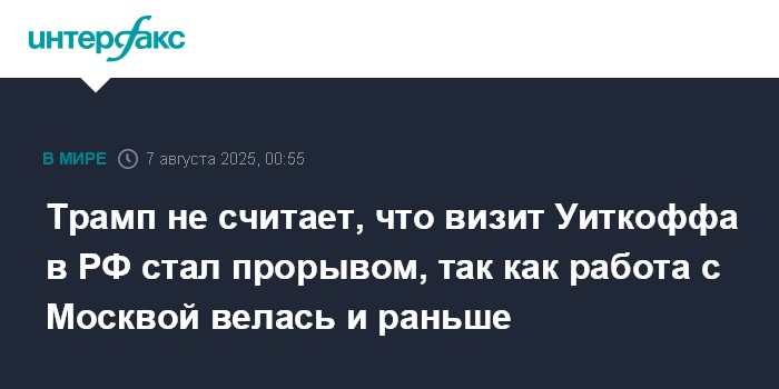Трамп не считает, что визит Уиткоффа в РФ стал прорывом, так как работа с Москвой велась и раньше