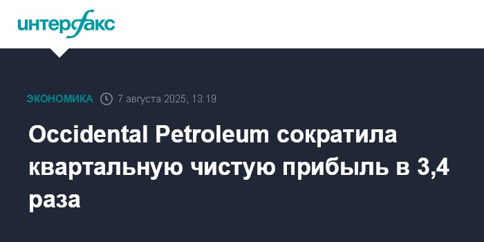 Москва. 7 августа. INTERFAX.RU - Американский сланцевый производитель Occidental Petroleum во втором квартале 2025 года сократил чистую прибыль в 3,4 раза, при этом скорректированная прибыль и выручка превзошли ожидания аналитиков.