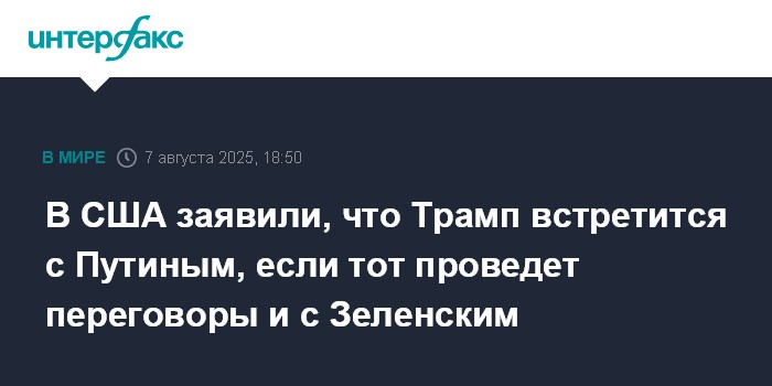 Москва. 7 августа. INTERFAX.RU - Президент США Дональд Трамп намерен провести встречу с главой российского государства Владимиром Путиным, если Путин также проведет переговоры с украинским лидером Владимиром Зеленским, сообщает New York Post со ссылкой на неназванного сотрудника Белого дома.