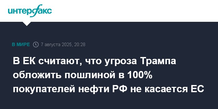 Москва. 7 августа. INTERFAX.RU - Угроза президента США Дональда Трампа ввести пошлины в размере 100% в отношении стран, покупающих российскую нефть, не касается Евросоюза, так как объединение работает над сокращением импорта из РФ, считают в Еврокомиссии (ЕК).