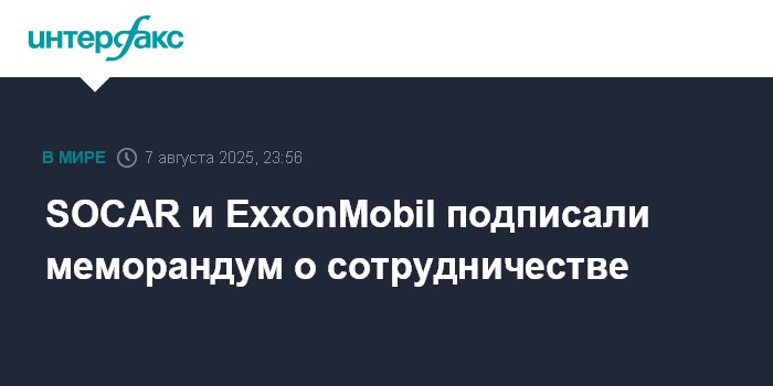 Москва. 7 августа. INTERFAX.RU - Азербайджанская государственная нефтяная компания (SOCAR, ГНКАР) и американская ExxonMobil подписали меморандум о сотрудничестве, сообщает сайт президента Азербайджана.