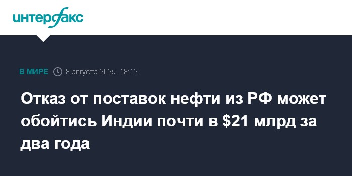 Москва. 8 августа. INTERFAX.RU - Расходы Индии на импорт нефти в случае отказа от российских поставок могут вырасти на $9 млрд в текущем 2026 финансовом году (начался в апреле 2025 года) и на $11,7 млрд в 2027 фингоду. Об этом сообщает NDTV со ссылкой на доклад State Bank of India (SBI).