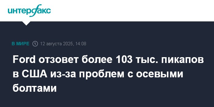 Москва. 12 августа. INTERFAX.RU - Американский автопроизводитель Ford Motor отзывает более 103 тыс. пикапов модели F-150 в США в связи с проблемой с осевыми болтами, Об этом сообщило Национальное управление по безопасности дорожного движения США (NHTSA).