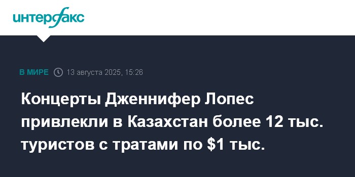 Москва. 13 августа. INTERFAX.RU - Концерты Дженнифер Лопес, прошедшие в Астане и Алма-Ате, привлекли в Казахстан более 12 тыс. туристов из соседних стран, каждый из них оставил около $1 тыс., сообщил министр финансов страны Мади Такиев.