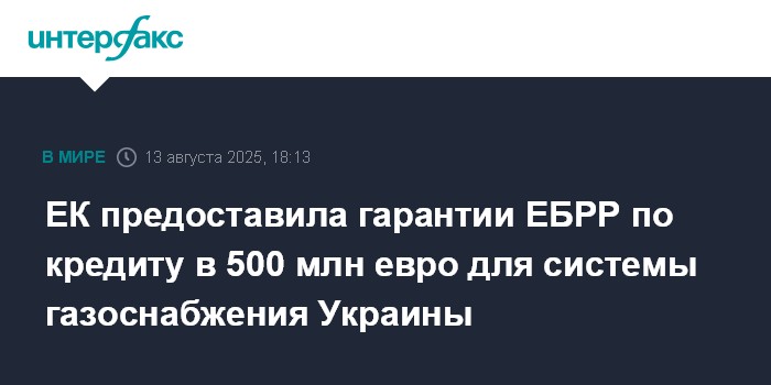 Москва. 13 августа. INTERFAX.RU - Еврокомиссия (ЕК) подписала в среду гарантийное соглашение с Европейским банком реконструкции и развития (ЕБРР), которое позволит получить кредит в размере 500 млн евро "на энергетическую безопасность Украины", сообщило представительство ЕС в Киеве.