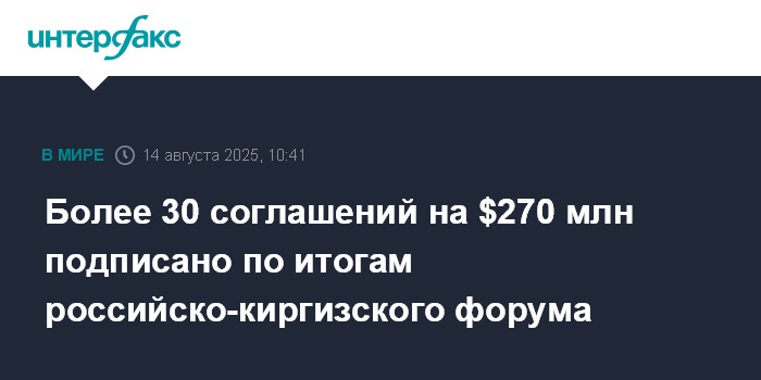 Москва. 14 августа. INTERFAX.RU - Соглашения на сумму $270 млн подписаны по итогам Российско-киргизского экономического форума, проходящего на побережье озера Иссык-Куль в Киргизии, сообщил журналистам глава Российско-киргизского фонда развития (РКФР) Артём Новиков.
