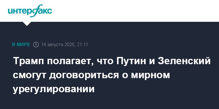 Москва. 14 августа. INTERFAX.RU - Президент США Дональд Трамп считает, что президент России Владимир Путин и президент Украины Владимир Зеленский смогут найти способ для урегулирования украинского конфликта.