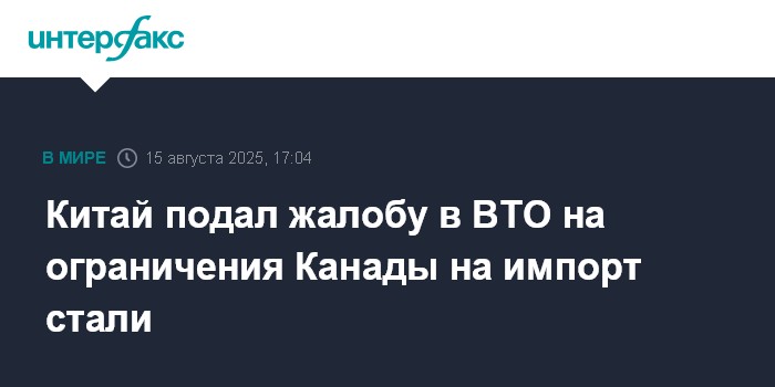 Москва. 15 августа. INTERFAX.RU - Китай подал жалобу во Всемирную торговую организацию (ВТО) из-за введенных Канадой ограничений на импорт стали и стальную продукцию, говорится в сообщении министерства торговли КНР в пятницу.