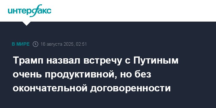 "Я считаю, что у нас была очень продуктивная встреча: по многим вопросам мы пришли к согласию", - сказал Трамп по завершении переговоров с президентом РФ Владимиром Путиным в Анкоридже.