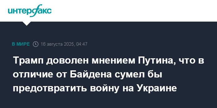 Москва. 16 августа. INTERFAX.RU - Президент США Дональд Трамп заявил, что обрадовался словам президента РФ Владимира Путина, когда услышал о том, что если бы он был президентом США вместо Джо Байдена, смог бы предотвратить войну на Украине.