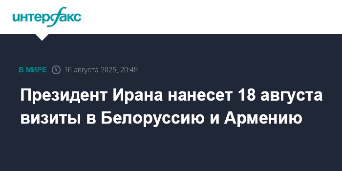 "Пезешкиан отправится в двухдневную поездку в Армению и Белорусию вечером в понедельник, 18 августа. Среди целей поездки - укрепление отношений между двумя странами, особенно в сфере торговли, и подписание документов", - говорится в сообщении в соцсетях советника.