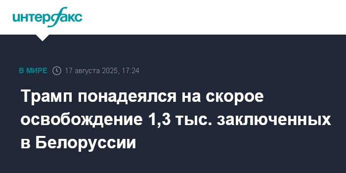 Москва. 17 августа. INTERFAX.RU - Президент США Дональд Трамп в воскресенье высказал благодарность президенту Белоруссии Александра Лукашенко за недавнее решение помиловать ряд заключенных, выразив надежду на освобождение еще более 1 тыс. человек.