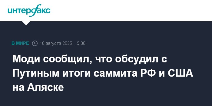 Москва. 18 августа. INTERFAX.RU - Премьер-министр Индии Нарендра Моди в понедельник сообщил, что провел телефонный разговор с президентом РФ Владимиром Путиным, в ходе которого они обсудили результаты российско-американского саммита на Аляске.