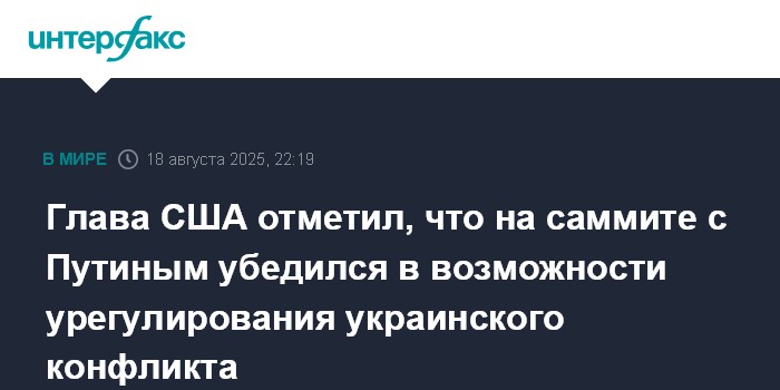 Москва. 18 августа. INTERFAX.RU - Президент США Дональд Трамп заявил, что в ходе встречи с президентом России Владимиром Путиным убедился в возможности достижения украинского урегулирования, хотя это и сложная задача.