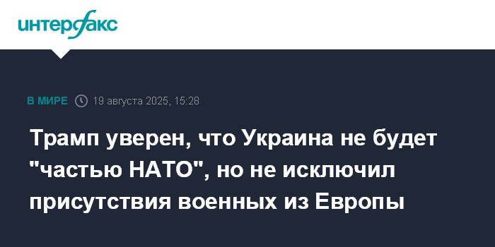 Москва. 19 августа. INTERFAX.RU - Президент США Дональд Трамп во вторник заявил, что российская сторона, возможно, не будет возражать против размещения на Украине сил европейских стран в рамках урегулирования украинского конфликта.