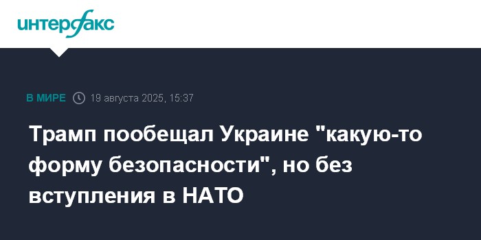 Москва. 19 августа. INTERFAX.RU - Киев получит по итогам украинского урегулирования некоторую форму безопасности, которая не предусматривает членство в НАТО, заявил во вторник президент США Дональд Трамп в эфире телеканала Fox News.