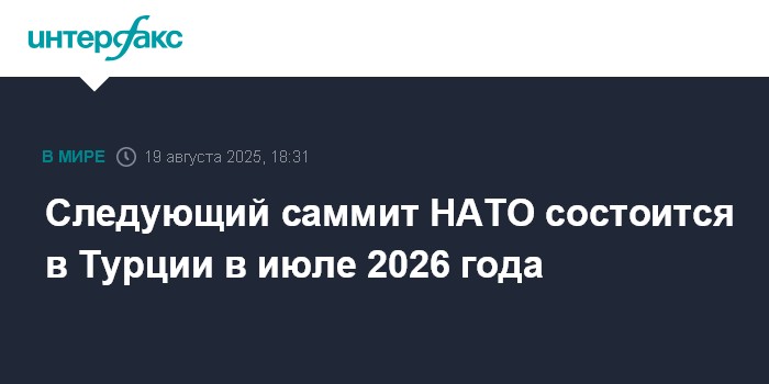 Москва. 19 августа. INTERFAX.RU - Генеральный секретарь НАТО Марк Рютте объявил, что саммит Североатлантического альянса в 2026 году пройдет 7-8 июля в Анкаре. Об этом сообщает пресс-служба штаба организации.