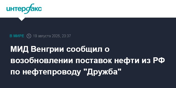 Москва. 19 августа. INTERFAX.RU - Глава венгерского МИД Петер Сийярто во вторник заявил, что Россия починила поврежденный в результате украинской атаки нефтепровод "Дружба", поставки нефти в Венгрию возобновлены.