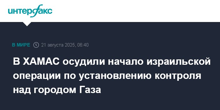 Москва. 21 августа. INTERFAX.RU - В палестинском движении ХАМАС осудили начало реализации плана Израиля по взятию под контроль города Газа.