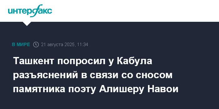 Москва. 21 августа. INTERFAX.RU - Министерство иностранных дел Узбекистана заявило, что запросило у правительства Афганистана комментарии в связи со сносом памятника узбекскому поэту и мыслителю Алишеру Навои в городе Мазари-Шариф.