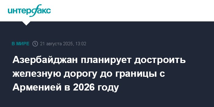 Москва. 21 августа. INTERFAX.RU - Азербайджан планирует в 2026 году завершить строительство железной дороги до границы с Арменией, заявил на встрече с жителями города Кяльбаджар азербайджанский президент Ильхам Алиев.