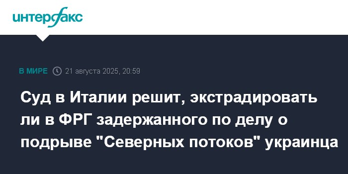Москва. 21 августа. INTERFAX.RU - Апелляционный суд в Болонье вынесет решение об экстрадиции в Германию бывшего украинского военного, подозреваемого в подрыве "Северных потоков" и задержанного ранее в четверг в Италии, сообщает в четверг газета The Wall Street Journal (WSJ) со ссылкой на следователей.