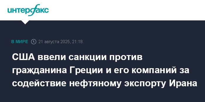 Москва. 21 августа. INTERFAX.RU - Минфин США ввел санкции в отношении гражданина Греции и связанной с ним сети компаний с целью противодействовать экспорту нефти Ираном.