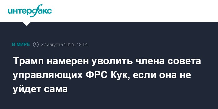 Москва. 22 августа. INTERFAX.RU - Президент США Дональд Трамп заявил, что уволит члена совета управляющих Федеральной резервной системы (ФРС) Лизу Кук, если она сама не подаст в отставку.