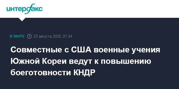 Москва. 23 августа. INTERFAX.RU - Совместные военные учения южнокорейских и американских войск в районе Корейского полуострова носят провокационный характер и вынуждают КНДР активно повышать боеготовность своих вооруженных сил, заявил представитель Генштаба Корейской народной армии (КНА).
