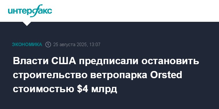 Москва. 25 августа. INTERFAX.RU - Американские власти предписали остановить строительство готового на 80% офшорного ветропарка Revolution Wind датской Orsted A/S, сообщил этот оператор ветроэлектростанций.
