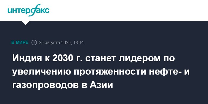 Москва. 25 августа. INTERFAX.RU - Растущий спрос на энергоносители в развивающихся странах и ряд других факторов будут способствовать развитию трубопроводной инфраструктуры в Азии, при этом Индия к 2030 году станет лидером в регионе по увеличению протяженности нефте- и газопроводов, пишет отраслевое издание Offshore Technology со ссылкой на исследование GlobalData Energy.