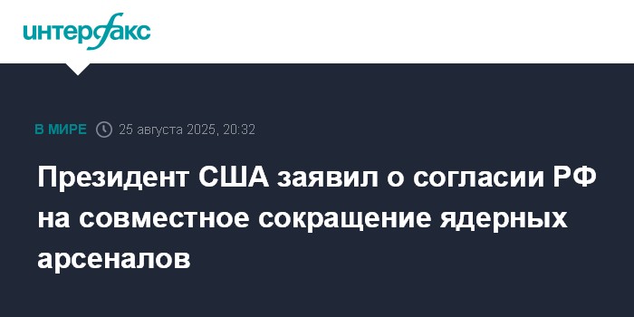 Москва. 25 августа. INTERFAX.RU - Власти РФ согласны вместе с США сокращать ядерные арсеналы, заявил в понедельник американский президент Дональд Трамп.