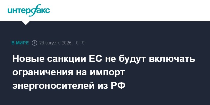 Москва. 26 августа. INTERFAX.RU - Новый пакет санкций Евросоюза в отношении России не будет включать в себя ограничение на импорт российских энергоносителей, пишет Politico во вторник.