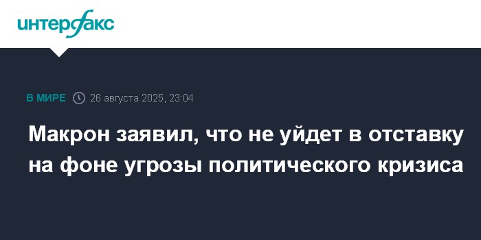 Москва. 26 августа. INTERFAX.RU - Президент Франции Эммануэль Макрон в обстановке вероятного падения правительства Франсуа Байру, которому предстоит 8 сентября голосование по доверию в Национальном собрании, в интервью JDNews исключил возможность своей отставки.