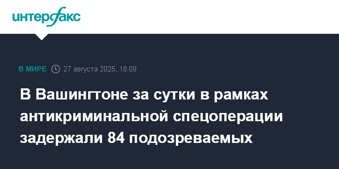 Москва. 27 августа. INTERFAX.RU - В Вашингтоне за сутки задержали 84 человека в рамках объявленных президентом Дональдом Трампом мер для борьбы с преступностью, сообщила в соцсети генпрокурор США Памела Бонди.